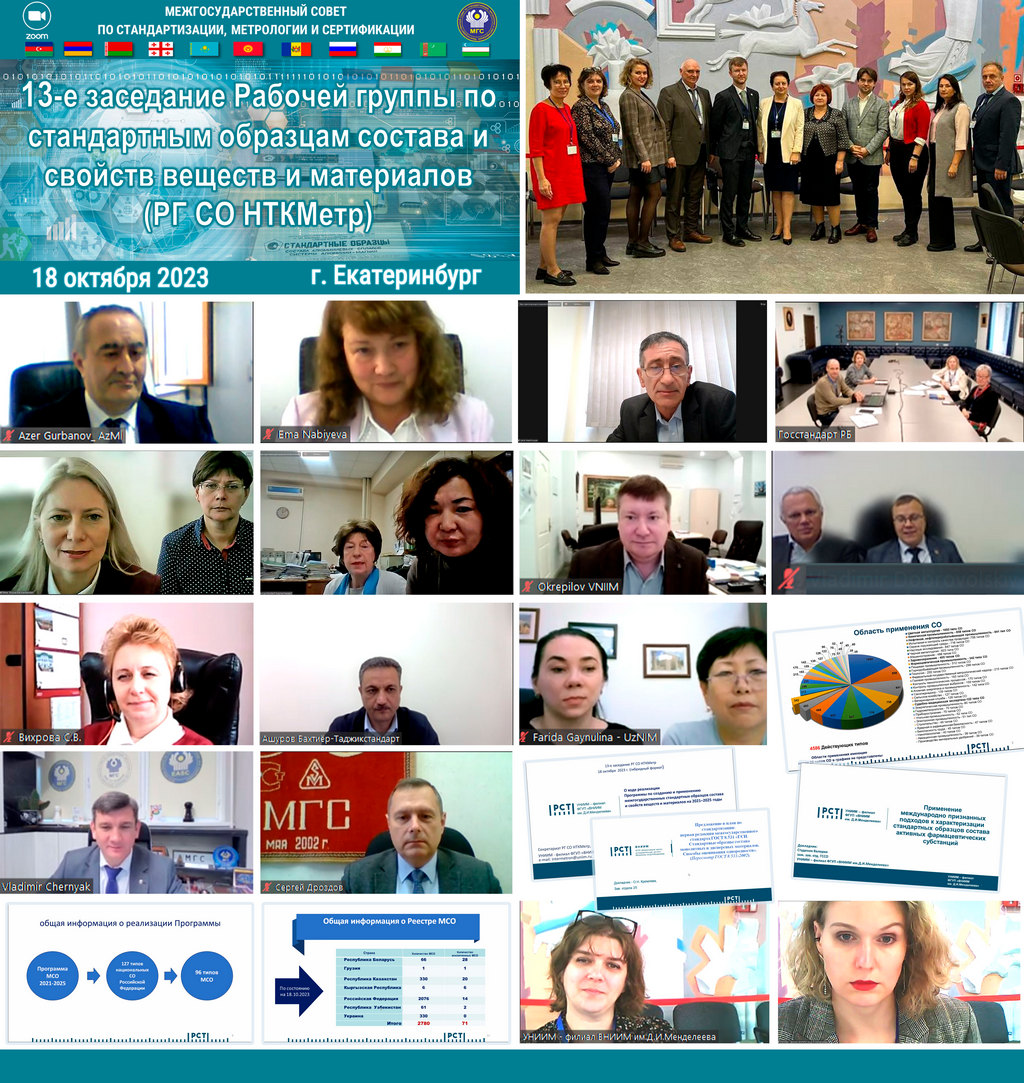 18 октября 2023 года в г. Екатеринбурге, Российская Федерация, в гибридном формате состоялось 13-е заседание Рабочей группы по стандартным образцам состава и свойств веществ и материалов Научно-технической комиссии по метрологии (РГ СО НТКМетр) Межгосударственного совета по стандартизации, метрологии и сертификации