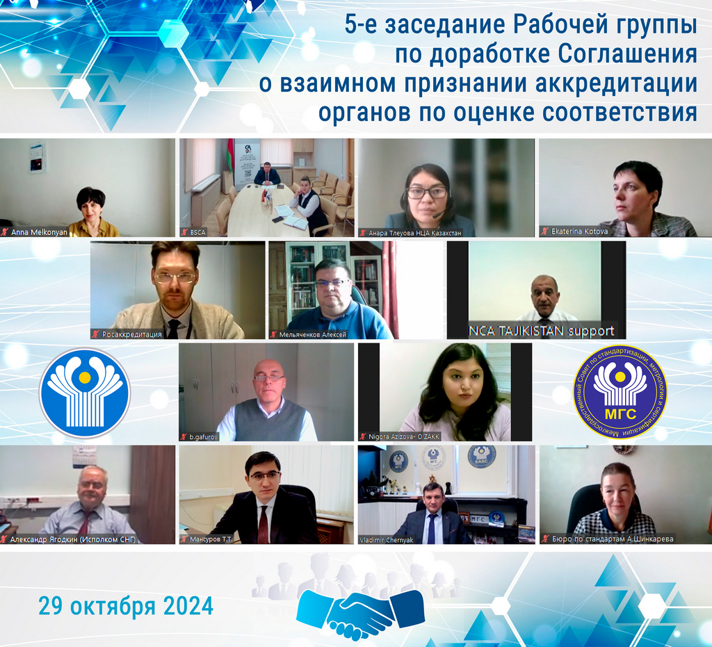 29 октября 2024 года в режиме видеоконференции состоялось 5-е заседание Рабочей группы по доработке Соглашения о взаимном признании аккредитации органов по оценке соответствия (РГ ВПА) Межгосударственного совета по стандартизации, метрологии и сертификации