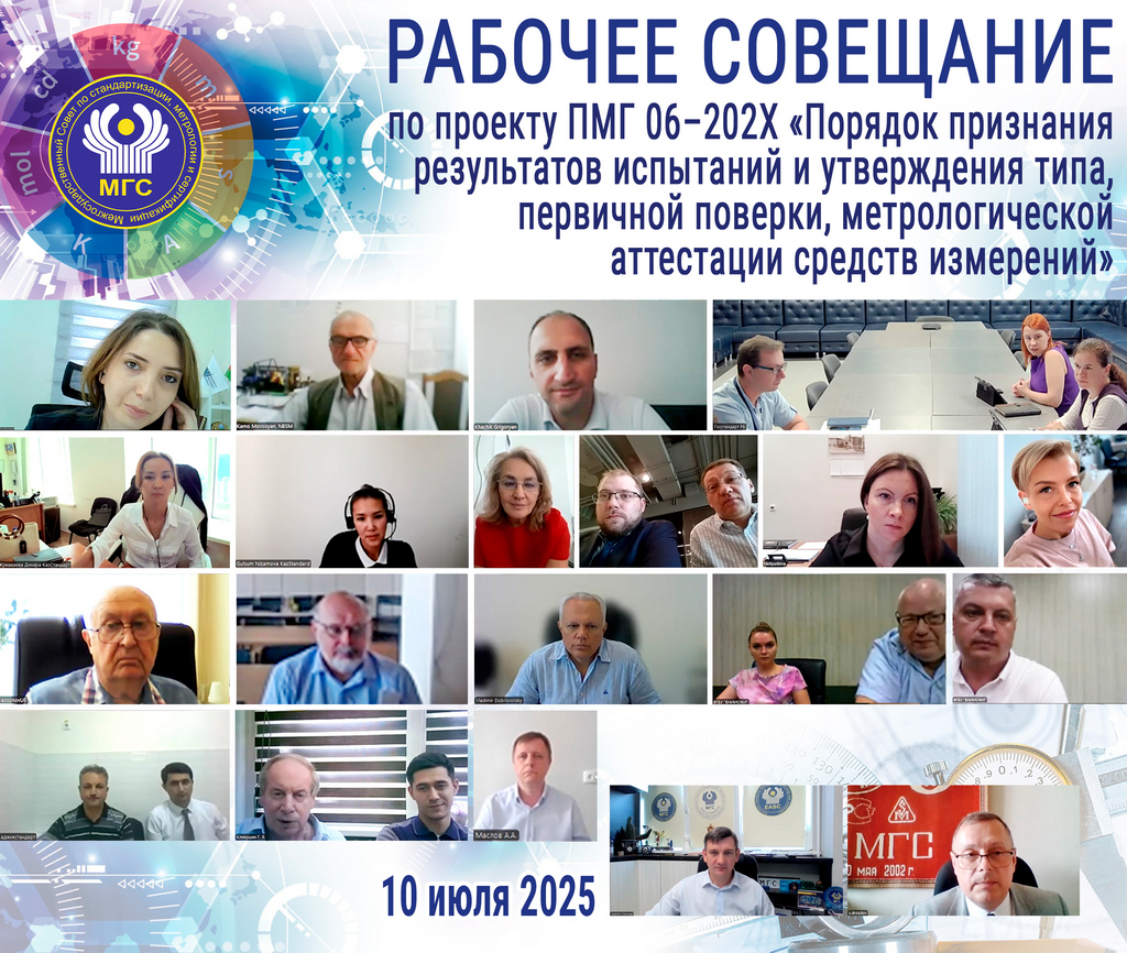 10 июля 2025 года проведено рабочее совещание по рассмотрению проекта ПМГ 06–202Х «Порядок признания результатов испытаний и утверждения типа, первичной поверки, метрологической аттестации средств измерений»