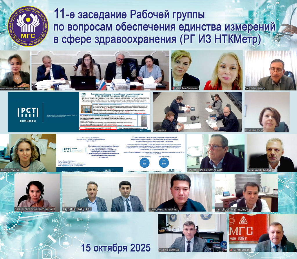15 октября 2025 года в г. Москве, Российская Федерация, в гибридном формате состоялось 11-е заседание Рабочей группы по вопросам обеспечения единства измерений в сфере здравоохранения Научно-технической комиссии по метрологии (РГ ИЗ НТКМетр) Межгосударственного совета по стандартизации, метрологии и сертификации