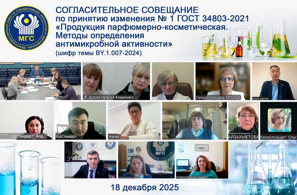 18 декабря 2025 года состоялось согласительное совещание между национальными органами Республики Беларусь и Республики Казахстан с целью снятия разногласий, возникших между разработчиком изменения № 1 ГОСТ 34803–2021 «Продукция парфюмерно-косметическая. Методы определения антимикробной активности» – РУП «БелГИМ» (Республика Беларусь) и представителем, предоставившего замечания к окончательной редакции проекта изменения – ТОО «ПК» Аврора» (Республика Казахстан) при непосредственном участии профильного межгосударственного технического комитета МТК 529 «Парфюмерно-косметическая продукция».